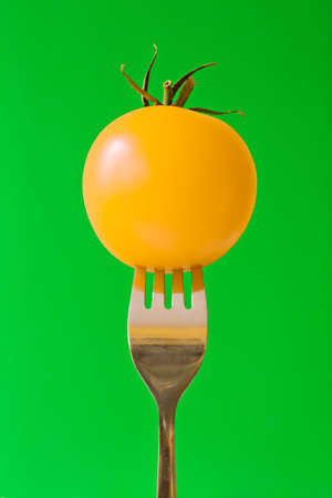 fork with yellow tomato, isolated on green background