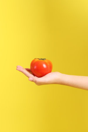 Vivid red tomato on bright yellow background showing fresh produce.