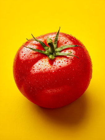 Close-up of a single fresh tomato with water droplets, placed against a vibrant yellow background, emphasizing freshness and natural produce.