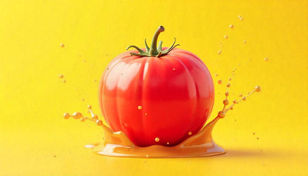 Fresh tomato with juice splash on vibrant yellow background