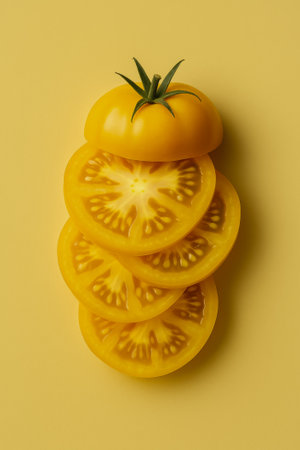 A vibrant yellow tomato sliced and stacked against a matching yellow background