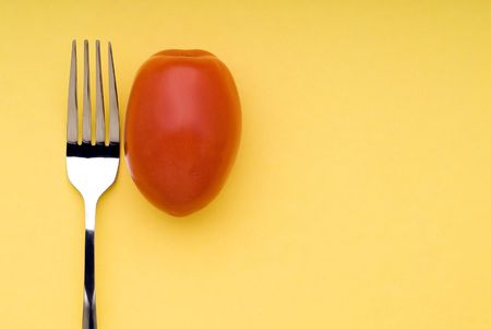 snappy image of a fork and a tomato on a bright yellow background