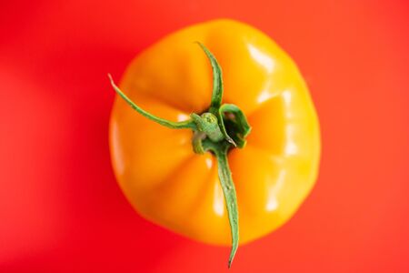 fresh ripe yellow tomato on red background close up. vegetables and healthy food