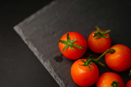 Red cherry tomatoes lie on a black stone slate board, background.