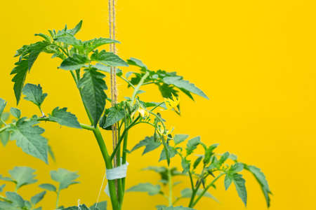 Close up of a Small Truss of Small Yellow Tomato Flowers in Garden, on yellow background.
