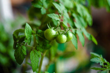 Unripe small tomatoes growing on the windowsill. Fresh mini vegetables in the greenhouse on a branch with the green fruits. The shrub immature vegetables on stems. Young fruit on bush. Soft focus.