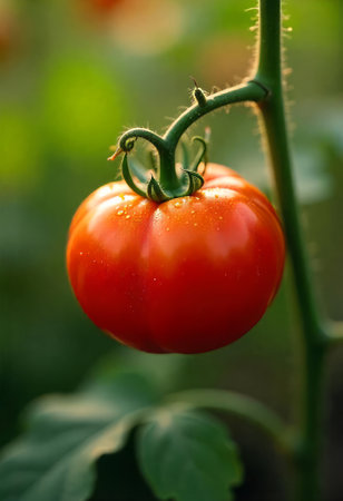 A ripe tomato hangs on its vine, adorned with droplets of morning dew. Sunlight filters through trees, casting a warm glow over the garden, showcasing the beauty of natures harvest.