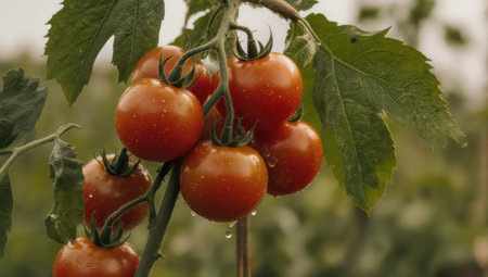 A vibrant cluster of ripe red tomatoes hanging from a lush green plant with water droplets