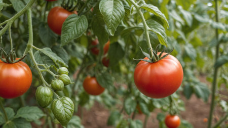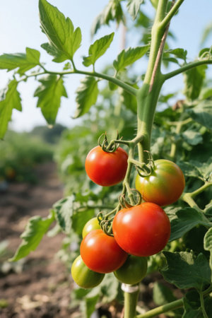Lush tomato plants thrive under a bright sky, showcasing ripe, red fruit ready for harvest. This image captures the essence of fresh agriculture and healthy living.