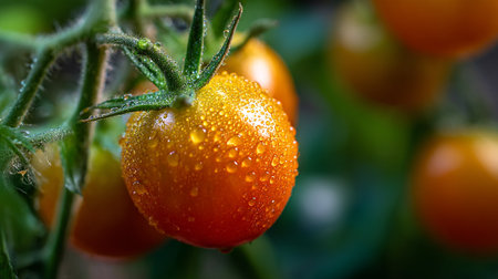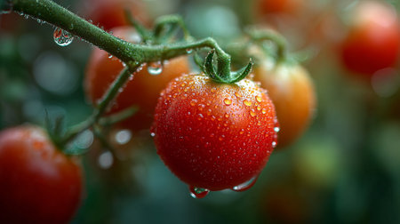 A ripe red tomato on the vine, with water droplets, in a garden with a blurred green background