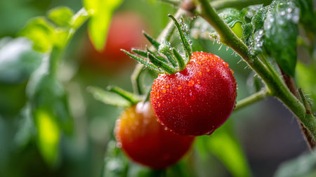 Close-up of fresh red tomatoes adorned with dew droplets, growing on lush green vines in a summer garden, illuminated by warm sunset light.
