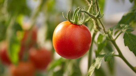 AI Generated. Single Red Tomato Attached to Vine Branch