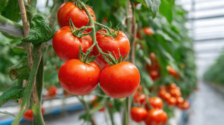 Within a tranquil greenhouse, rows of flourishing tomato plants boast ripe red fruits. Water droplets sparkle on the verdant leaves, enhancing the beauty of this thriving environment.