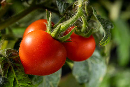Fresh red ripe tomatoes hanging on the vine plant growing in organic garden