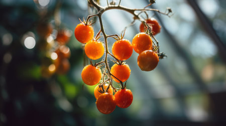 A close-up view of bright orange cherry tomatoes hanging from a branch in a sunlit greenhouse, creating a warm and vibrant atmosphere ideal for highlighting organic produce.