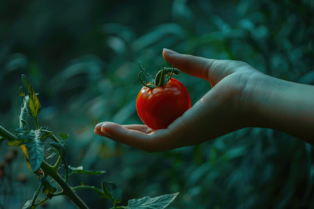 A person gently holds a beautifully vibrant ripe red tomato in their hand against a backdrop of lush greenery.
