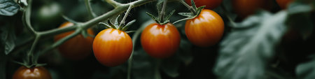 Fresh tomatoes on the vine in a greenhouse, ready for harvesting. High quality photo