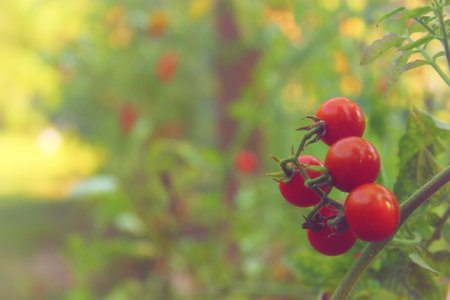 close-up of cherry tomato plant outdoor in sunny vegetable garden shot at shallow depth of field