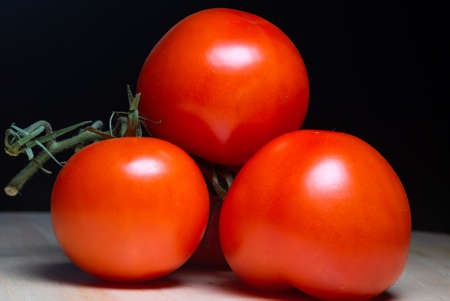 red tomatoes lie on a wooden board on a black background.