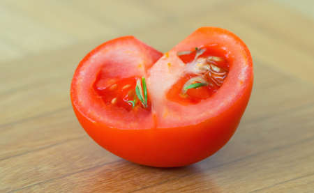 Halves of a tomato isolated on a white background, top view, horizontal orientation, closeup