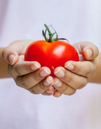 Tomato on hand in a bright background