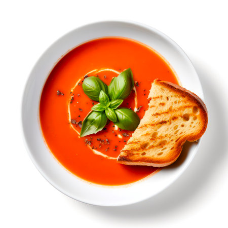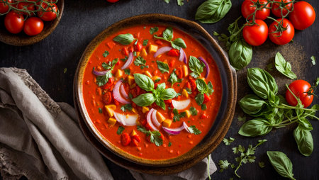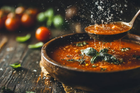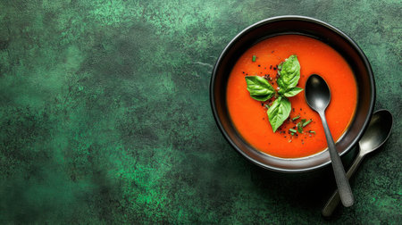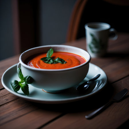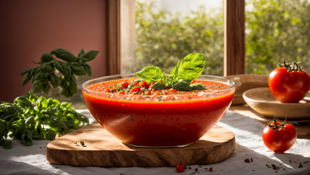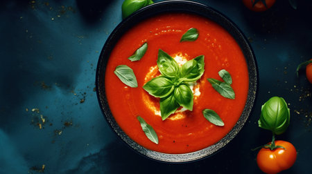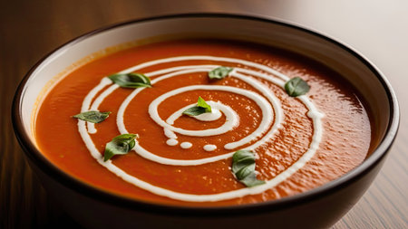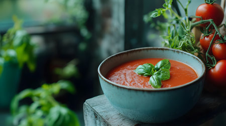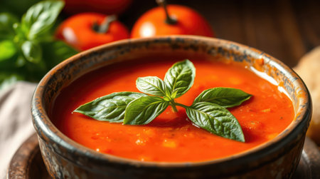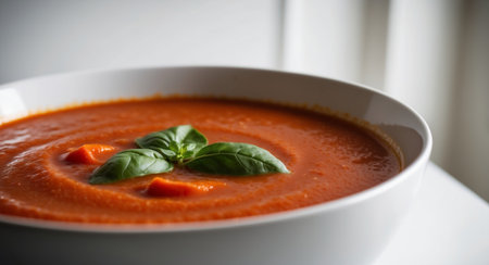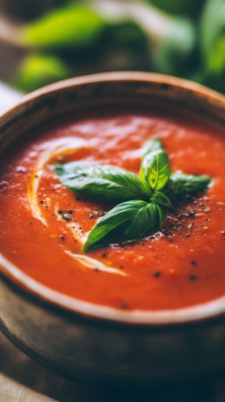 A vibrant bowl of tomato soup garnished with fresh basil leaves, perfect for a comforting meal. Ideal for culinary lovers and healthy dining.