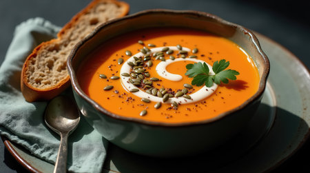 A vibrant bowl of creamy pumpkin soup is garnished with seeds and a drizzle of cream. A piece of fresh bread sits beside it on a cloth, capturing a cozy autumn meal setting.