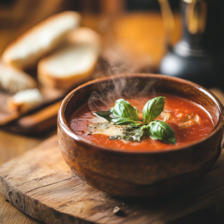 Cozy dining experience with steaming tomato basil soup on rustic wooden table setting