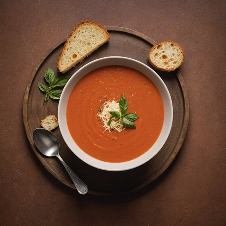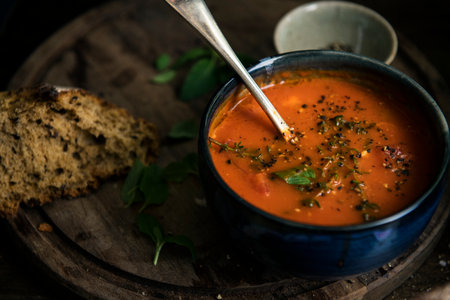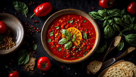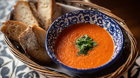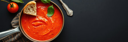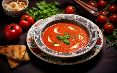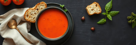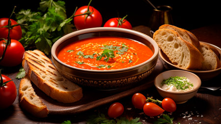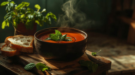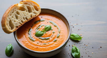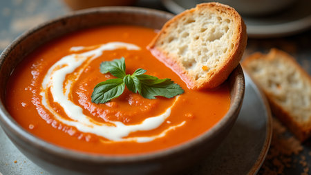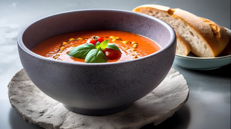 Delicious bowl of homemade tomato soup with fresh basil and crusty bread on a dark background