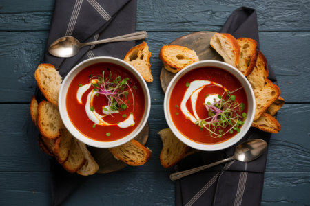 Tomato Soup with Cream and Microgreens in White Bowls, Served with Crusty Bread on Dark Wooden Table