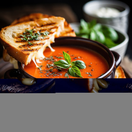 A bowl of comforting tomato basil soup with a grilled cheese sandwich on the side. Generative AI