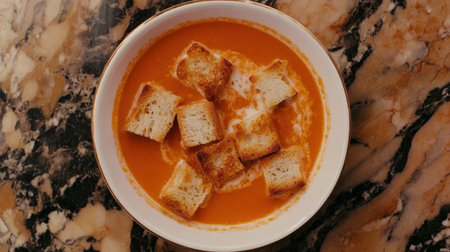 A vibrant bowl of creamy tomato soup topped with crispy croutons sits on a sleek marble surface, ideal for capturing the essence of comfort food.