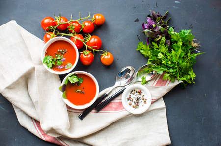 Top view tomato soup with vegetables ingredients on gray tablecloth, vegan food banner with copy space.