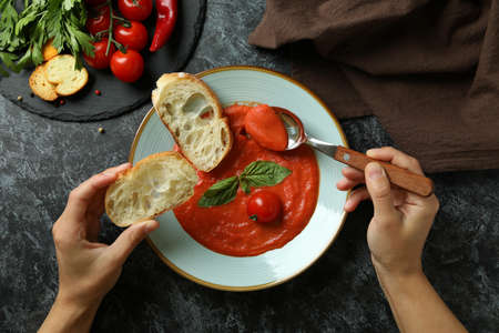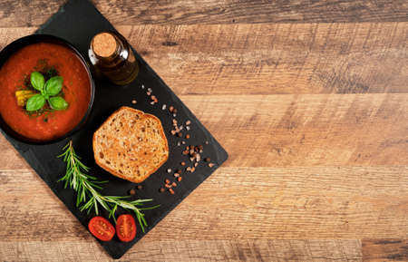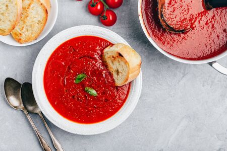 Tomato basil soup with bread toasts on gray stone background, top view