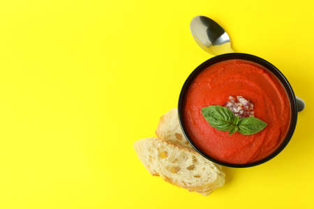 Concept of tasty eating with Gazpacho soup on yellow background