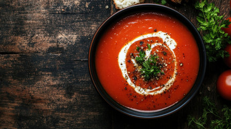 Top view of a bowl of creamy tomato soup with fresh herbs and a swirl of cream on a dark wooden table