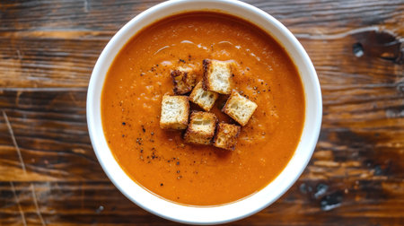 A vibrant bowl of creamy tomato soup topped with crispy croutons, perfect for a comforting meal. Ideal for lunch or dinner, showcasing rustic charm.