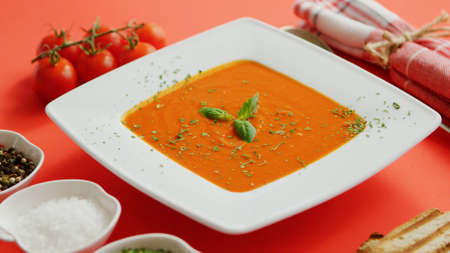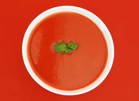 tomato soup in white bowl, red background