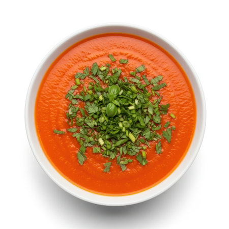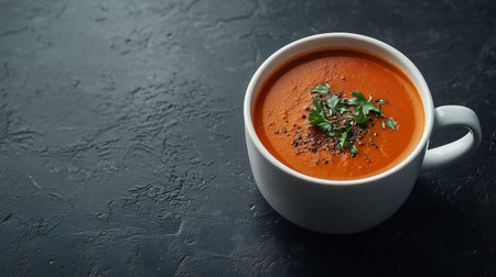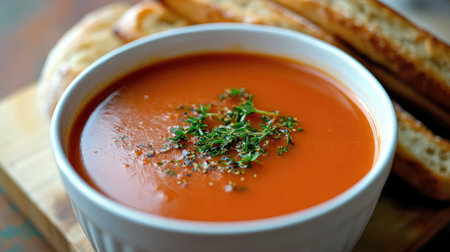 A delicious creamy tomato soup garnished with fresh herbs, served in a white bowl. This appetizing dish showcases vibrant colors and perfect texture for any meal.