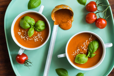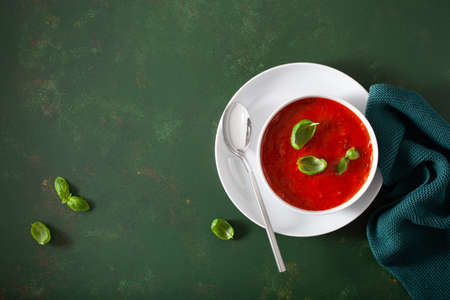 Homemade tomato soup with green basil, top view