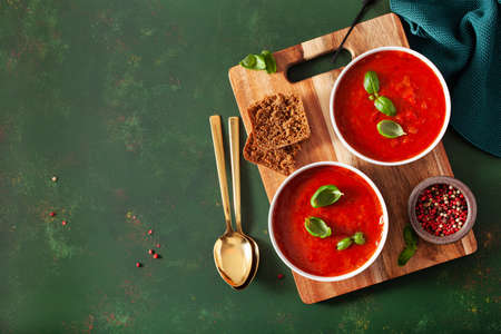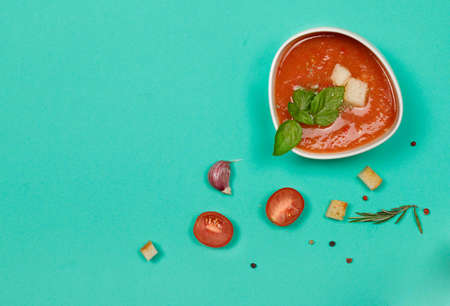 Tomato gazpacho soup with basil and croutons, refreshing vegetarian puree soup. Spanish cuisine. Flatlay on a green background, horizontal, a copy of the space