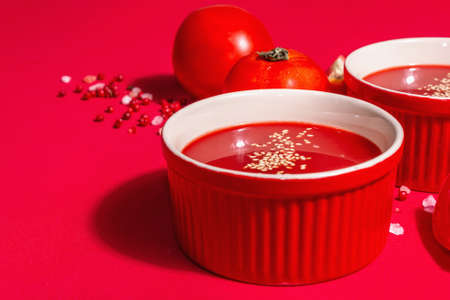 Tomato soup with sesame seeds in bowls on a red background. Ripe vegetables, rose Himalayan salt, pink peppercorn. A modern hard light, dark shadow, close up