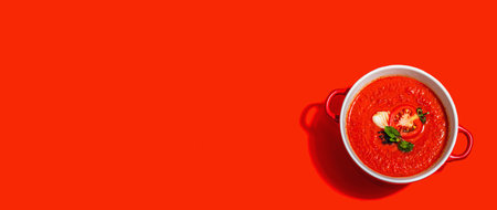 Spicy tomato soup. Healthy vegan hot dish, croutons, vintage cutlery. Bright red background, trendy hard light, dark shadow, banner format