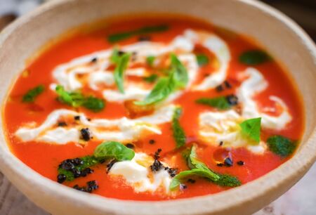 Tomato soup with basil garnish in a rustic bowl, close-up view. Culinary and comfort food concept
