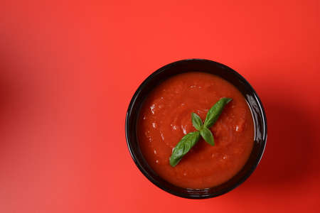 Italian tomato sauce with basil, on red background