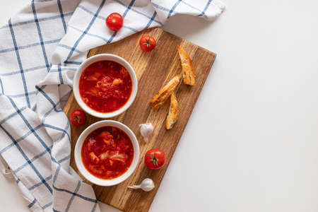 Homemade Traditional Ukrainian beet soup with fresh green dill. Russian borscht in bowl of tomatoes, sour cream, and mushrooms on white background with copy space.