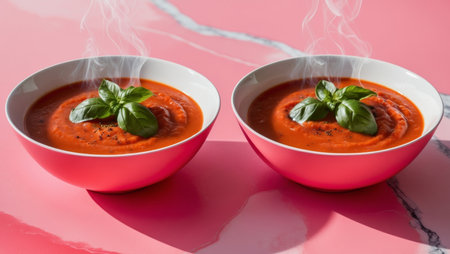 AI Generated. Two Bowls of Tomato Soup with Basil Garnish on Pink and Marble Backgrounds