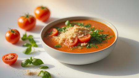 A vibrant bowl of fresh tomato soup garnished with basil leaves, placed against a minimal white background. Perfect for food photography, this image highlights aroma, warmth, and culinary delight.