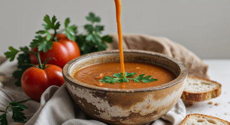 Creamy tomato soup in a bowl with parsley and bread