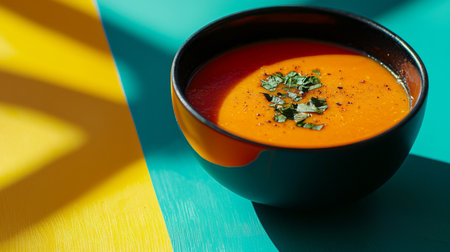 A richly colored bowl of tomato soup, garnished with fresh herbs and pepper, is beautifully presented on a striking turquoise and yellow background.